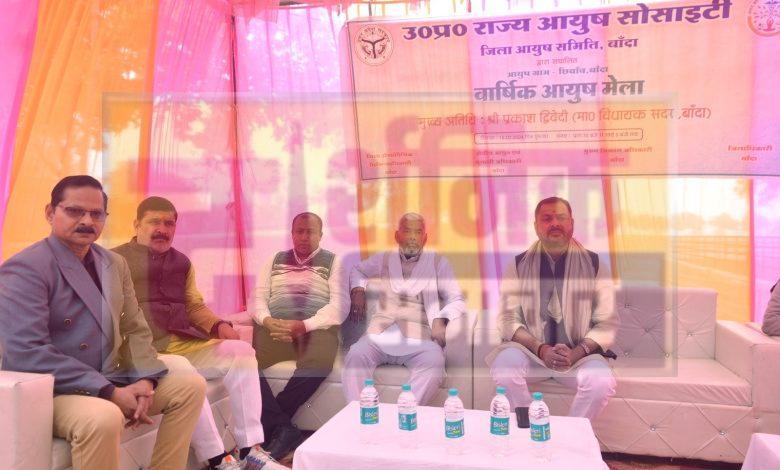 बांदा। आयुष मेले का आयोजन ग्राम पंचायत छिबांव मे किया गया। इसका शुभारंभ कार्यक्रम के मुख्य अतिथि सदर विधायक प्रकाश द्विवेदी ने फीता काटकर किया। उन्होने कहा कि मुख्यमंत्री योगी आदित्यनाथ के तेनृत्व मे आयुर्वेद की मांग बढ़ रही है। गांव-गांव, घर-घर आयुर्वेद पहुंच रहा है। कहा कि आयुर्वेद दवा नही जीवनदर्शन है और यह जीने की राह सिखाता है। इसका कोई साइडइफेक्ट नही है। सदर विधायक ने कहा कि हमारे पूर्वजों ने बचपन मे छोटी-मोटी बीमारियां घरेलू उपचार से ठीक हो जाती थीं। उन्होने कहा कि मेले का उद्देश्य गांव के आस-पास के लोग विभिन्न व्याधियों से ग्रसित हैं एक ही स्थान पर उपचार हो इसी उद्देश्य से होम्योपैथी, आयुर्वेदिक एवं यूनानी योग विद्या के डाक्टर एवं वैद्यों को एक ही स्थान पर एकत्र कर मेले का आयोजन किया गया है। इसका लाभ बडी संख्या मे लोग ले रहे हैं। उन्होने कहा कि आयुर्वेद विभाग ने एक अच्छा प्रयास किया है आगे भी ऐसे मेले आयोजित होंगे ऐसा प्रयास किया जाएगा। उप जिलाधिकारी अतर्रा राघवेन्द्र सिंह ने कहा कि आयुर्वेद की औषधियों को बचाने के लिए सभी को आयुर्वेद औषधियों के वृक्षारोपण करने के लिए आना चाहिए। आयुर्वेदिक कालेज अतर्रा के प्रधानाचार्य हेमंत कुमार राय ने सुझाव दिया कि स्वस्थ्य रहने के लिए प्रातः काल उठकर आयुर्वेद के अनुसार योग से जीवन की शुरूआत करें। जिला विकास अधिकारी रमाशंकर सिंह ने कहा कि आयुर्वेद बीमारियों को जड़ से समाप्त करता है। मेले मे सास-बहू सम्मेलन के जरिए बहू ने सास से दैनिक जीवन के लिए परिवार एवं बच्चों के लिए आयुर्वेदिक नुक्से सीखें एवं इसका पालन करें। योग चैंपियनशिप प्रतियोगिता का भी आयोजन के साथ ही स्वस्थ्य बेबी प्रतियोगिता का आयोजन कर इन्हे पुरस्कृत किया गया। आयुष मेले का आयोजन क्षेत्रीय आयुर्वेदिक एवं यूनानी अधिकारी डॉ नीरेन्द्र बहादुर व नोडल अधिकारी डॉ जीतेन्द्र कुमार, होम्योपैथी अधिकारी डॉ संतोष मोनी ने किया। संचालन डॉ अर्चना भारती ने किया।