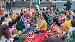 इसके बाद माता गौरा के हाथों में विधिवत मेहंदी रचाई गई। मंगलगीतों की स्वर-लहरियों के बीच महिलाओं ने पारंपरिक लोकगीत गाए—