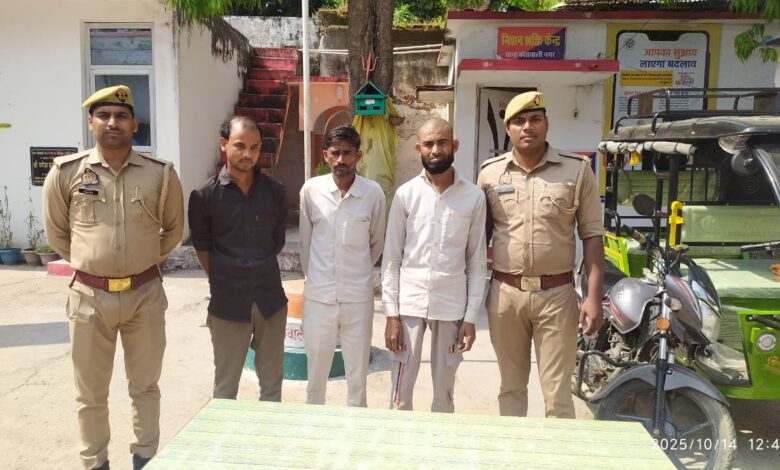 बांदा थाना कोतवाली नगर पुलिस द्वारा ई-रिक्शा चोरी करने वाले 03 अभियुक्तों को सूचना के 05 घंटे के भीतर चोरी के ई-रिक्शा सहित अवैध तमंचा व जिन्दा कारतूस आदि के साथ गिरफ्तार किया है । गौरतलब हो कि थाना मरका क्षेत्र के ग्राम इंगुवा के रहने वाले ई-रिक्शा चालक दीपक पुत्र मुन्ना ने थाना कोतवाली नगर पर सूचना दी कि रात्रि को रेलवे स्टेशन पर सवारी लेने के लिए गया था तभी एक मोटरसाइकिल पर 03 व्यक्ति आये और मवई से चलकर सामान लाने के लिए कहा और मोटरसाइकिल से 02 व्यक्ति उतरकर मेरे ई-रिक्शा में बैठ गए और उनका सामान लेने के चल दिया तथा मोटरसाइकिल चालक भी पीछे-पीछे चल दिया । ग्राम मवई तालाब के पास मै पेशाब करने के लिए उतरा तभी तीनों व्यक्ति मेरा ई-रिक्शा लेकर भाग गए । सूचना पर तत्काल अभियोग पंजीकृत करते हुए टीमों का गठन कर अभियुक्तों की गिरफ्तारी हेतु सम्भावित स्थानों पर तलाश की जा रही थी । इसी क्रम में पुलिस को सूचना प्राप्त हुई कि ग्राम मवई आर्यन रेंजर ढाबा से पहले कुछ संदिग्ध व्यक्ति मोटरसाइकिल व ई-रिक्शा के साथ खड़े है । पुलिस टीम द्वारा तत्काल मौके पर जाकर घेराबन्दी करते हुए 1.वीरेन्द्र उर्फ वीरेन्द्रा उर्फ चच्चा पुत्र गंगादीन 2. अशोक पुत्र लक्ष्मी 3. सिकंदर पुत्र मुन्ना को गिरफ्तार किया गया । मौके से चोरी के ई-रिक्शा, घटना में प्रयुक्त मोटरसाइकिल एवं तलाशी के दौरान चोरी के रुपए, मोबाइल फोन आदि तथा अभियुक्त वीरेन्द्र उर्फ चच्चा के कब्जे से अवैध तमंचा व जिन्दा कारतूस बरामद किया गया।