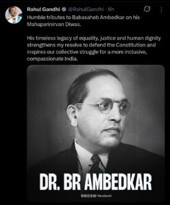 कांग्रेस नेता और लोकसभा में नेता प्रतिपक्ष राहुल गांधी ने डॉ. आंबेडकर को महापरिनिर्वाण दिवस पर याद करते हुए एक पोस्ट में लिखा है कि बाबासाहेब आंबेडकर के महापरिनिर्वाण दिवस पर उन्हें विनम्र श्रद्धांजलि। उनकी समानता, न्याय और मानवीय गरिमा की विरासत संविधान बचाने के मेरे संकल्प को मजबूत करती है और भारत और समावेशी और करुणाशील भारत बनाने में हमारे एकजुट संघर्ष को प्रेरित करती है।’ संसद परिसर में डॉ. आंबेडकर को श्रद्धांजलि देने के बाद राहुल गांधी ने मीडिया से बात करते हुए कहा ‘आंबेडकर जी एक आइकॉन हैं। उन्होंने पूरे देश को रास्ता दिखाया, उन्होंने हमें संविधान दिया। इसलिए, हम उन्हें याद करते हैं और उनके विचारों और संविधान की रक्षा करते हैं। हर भारतीय का संविधान खतरे में है। हम इसकी रक्षा करते हैं, नागरिक इसकी रक्षा करते हैं।