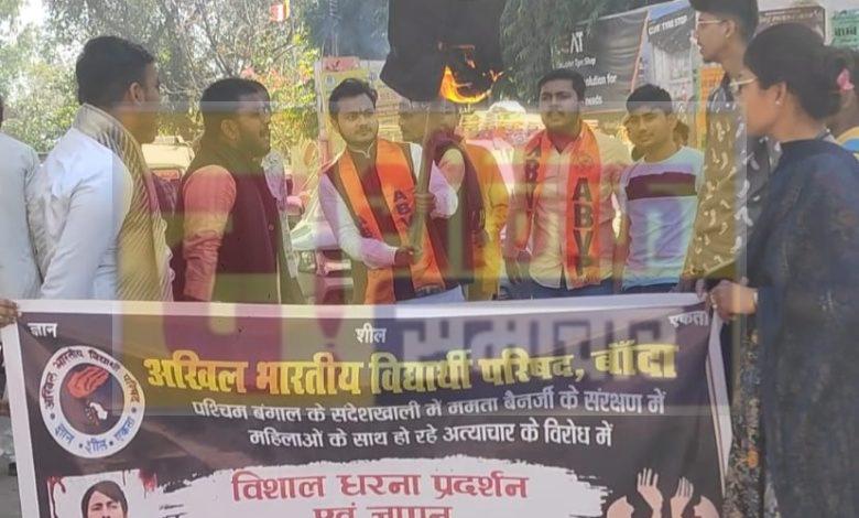 बांदा। पश्चिम बंगाल की मुख्यमंत्री का पुतला अखिल भारतीय विद्यार्थी परिषद ने मंगलवार को दहन किया। अभाविप ने कहा कि उनका 75 वर्षों से राष्ट्रीय हित में संघर्ष करता चला आ रहा है। पश्चिम बंगाल के संदेश खली का मामला सामने आया है। इससे पहले भी विभिन्न उत्पीड़न के मामले सामने आ चुके हैं। उन्होंने राष्ट्रपति को भेजे ज्ञापन में कहा कि इस मामले का संज्ञान लेते हुए ममता बनर्जी सरकार के विरुद्ध कठोर कार्रवाई की जाए। अभाविप के पदाधिकारी कार्तिकेय गुप्ता ने ममता बनर्जी सरकार का पुतला दहन कर राष्ट्रपति को संबोधित ज्ञापन कलेक्ट्रेट में प्रभारी अधिकारी को सौंपा। ज्ञापन मे कहा है कि विद्यार्थी परिषद छात्र हितों के साथ राष्ट्र हितों एवं सामाजिक कार्यों में लगातार अग्रणी रहा है। दिव्यांशु मिश्रा ने बताया कि ममता बनर्जी सरकार के संरक्षण में स्वपोषित गुंडे, नेता, महिला उत्पीड़न को बढ़ावा दे रहे हैं। इस दौरान ज्योत्सना गुप्ता, अनामिका बेदी, आशीष अवस्थी, स्वतंत्र साहू, श्लोक द्विवेदी, युवराज सिंह, अभय साहू, यश केसरवानी, रोहन द्विवेदी, राघव तिवारी आदि मौजूद रहे।
