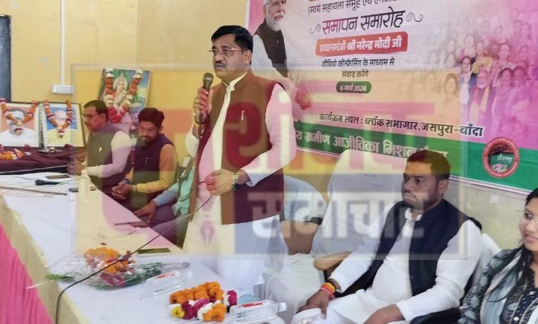 बांदा। जिले के विकास खंड जसपुरा मे शक्ति वंदन अभियान के समापन समारोह मे प्रदेश के जलशक्ति राज्य मंत्री रामकेश निषाद ने शिरकत की। उन्होने सर्वप्रथम मां सरस्वती के चित्र पर माल्यार्पण कर आरती की। जलशक्ति राज्यमंत्री ने कहा कि सरकार ने महिलाओं को आत्मनिर्भर बनाने का काम किया है। महिलाएं हवाई जहाज चला रही हैं और 2047 तक देश को विकसित राष्ट्र बनाए जाने की कल्पना मोदी सरकार ने किया है। उन्होने वीरांगनाओं, कालिंजर की रानी दुर्गावती व महालक्ष्मी बाई जैसी नारियों का भी बखान किया। खण्ड विकास अधिकारी गरिमा अग्रवाल ने कहा कि केन्द्र की मोदी व प्रदेश की योगी सरकार ने महिलाओं को सुरक्षा, संरक्षा व महिला सशक्तिकरण के लिए अतुलनीय योगदान दिया है। कहा कि महिला समूहों ने बेहतर कार्य किया है। उन्होने समूह की रजनी एवं मीनू सिंह के किए गये कार्यों की सराहना की। मण्डल अध्यक्ष अनूप सिंह ने पीएम आवास, उज्जवला योजना व महिलाओं को राशन कार्ड बनाए जाने को लेकर सरकार की उपलब्धियां गिनाईं। इस अवसर पर भाजपा नेता राज बहादुर सिंह, राकेश बाजपेयी, राकेश सिंह चौहान, सरोज सोनी, प्रदीप अनुरागी, योगेश सिंह, अभिनेन्द्र कुमार, शिवम आदि बड़ी संख्या मे लोग मौजूद रहे। संचालन संयुक्त खण्ड विकास अधिकारी ज्ञानेन्द्र कुमार यादव ने किया।