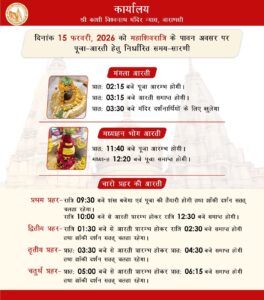 15 फरवरी: सुबह 2:15 से 3:15 बजे तक मंगला आरती होगी। इसके तुरंत बाद 3:30 बजे से श्रद्धालुजन के लिए दर्शन प्रारंभ हो जाएंगे।