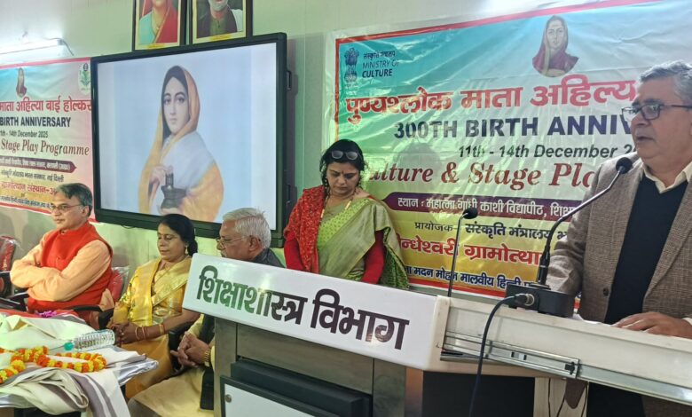 वाराणसी:- पुण्यश्लोक लोकमाता रानी अहिल्या बाई होलकर की 300वीं जयंती के अवसर पर संस्कृति मंत्रालय, भारत सरकार, नई दिल्ली द्वारा प्रायोजित और महामना मदन मोहन मालवीय हिन्दी पत्रकारिता संस्थान तथा पंडित दीनदयाल उपाध्याय शोधपीठ, महात्मा गांधी काशी विद्यापीठ एवं बिंदेश्वरी ग्रामोत्थान संस्थान, अमेठी, उत्तर प्रदेश के संयुक्त तत्वावधान में आयोजित चार दिवसीय राष्ट्रीय संगोष्ठी तथा सांस्कृतिक कार्यक्रम का शुभारंभ गुरुवार को हुआ। शिक्षाशास्त्र संकाय, काशी विद्यापीठ के ज्योतिबा फुले सभागार में आयोजित कार्यक्रम के पहले दिन देश की महान महिला शासक अहिल्या बाई होल्कर के जीवन, कार्यों और उनके धार्मिक एवं सांस्कृतिक योगदान पर विस्तृत चर्चा की गई। अध्यक्षता करते हुए काशी विद्यापीठ के कुलपति प्रो. आनन्द कुमार त्यागी ने कहा कि इतिहास में अनेक महान व्यक्तित्व हुए, परंतु मंदिरों के पुनर्निर्माण, समाज सुधार, संस्कृति संरक्षण और जनकल्याण के क्षेत्र में अहिल्याबाई होल्कर का स्थान अत्यंत विशिष्ट है। कुलपति प्रो. त्यागी ने कहा कि जब देश का समाज भय और अस्थिरता के दौर से गुजर रहा था, तब अहिल्या बाई होल्कर ने अपने नेतृत्व से समाज में आशा, विश्वास और पुनर्निर्माण की भावना जगाई। उन्होंने कहा कि अहिल्या बाई का संदेश है कि हार मानना समाधान नहीं, बल्कि पुनः प्रयास करना ही विजय का मार्ग है।