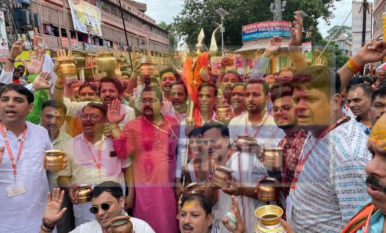वाराणसी:- प्रतिवर्ष की भांति इस वर्ष भी सावन के तीसरे सोमवार को विश्वनाथ गली व्यवसायी संघ के बैनर तले विश्वनाथ गली के व्यपारीयों ने बाबा विश्वनाथ का जलाभिषेक किया। जलाभिषेक कार्यक्रम के पहले विश्वनाथ गली के व्यापारीयों का समुह दशाश्वमेध स्थित चित्तरंजन पार्क पर इक्कठा होकर शोभायात्रा के रूप में डमरूओं की गड़गडाहट एंव शंखनाद के साथ सिंह द्वार,विश्वनाथ गली होते हुए काशी विश्वनाथ मंदिर पहुंच कर बाबा का जलाभिषेक किया।जलाभिषेक शोभायात्रा के पुर्व 11 वैदिक ब्राह्मणों द्वारा काशी के 84 घाटों के साथ काशी के 12 प्राचीन पौराणिक कुंडों क्रमानुसार चक्र-पुष्करणी (मणिकर्णिका घाट), लोलार्क कुंड (अस्सी), कुरूक्षेत्र कुंड (भदैनी-अस्सी), क्री-कुंड (रवीन्द्रपुरी कालोनी), मन्दाकिनी कुंड (कंपनीबाग), दुर्गाकुंड (दुर्गामंदिर), रामकुंड (श्री नगर कालोनी), लक्ष्मीकुंड (लक्सा), सुरजकुंड (पानदरीबा), पितरकुंडा (लल्लापुरा), पिशाचमोचन (मलदहिया), द्वारकाकुंड (शंकुलधारा) के जलों के कलशों का पुजन किया। पुजन के बाद हजारों की संख्या उपस्थित व्यापारी बंधु व परिवार की महिलाएं व पुरुष कलशों को लेकर बाबा विश्वनाथ का जलाभिषेक करने रवाना हुये।