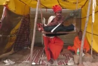 माघ मेले में लगातार खड़े होकर तपस्या कर रहे हठयोगी शंकर पुरी,बैठते ही नहीं –